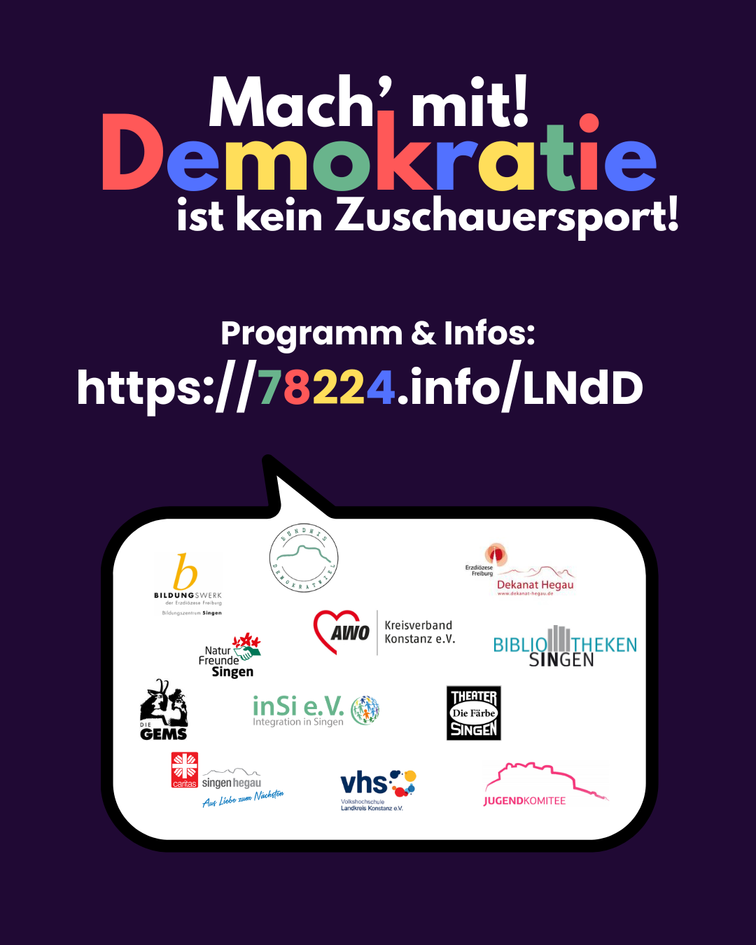 Kirchen, Kultureinrichtungen, Wohlfahrtsverbände, InSi e.V., Stadtbücherei, Landtagsabgeordnete, Naturfreunde, das Jugendkomitee und das Bündnis DemokraTwiel sowie Musikerinnen bieten an 9 Standorten in der Stadt kostenfreie Mitmach-Angebote. Komm vorbei, mach mit!